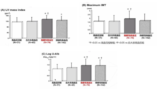 隱蔽性高血壓與靶器官損傷相關,且損傷水平與持續性高血壓相似,一項納入332例平均接受降壓藥物治療13年的門診高血壓患者的觀察性研究顯示,隱蔽性高血壓患者的左室質量指數(LVMI)、頸動脈超聲測量頸動脈最大內膜-中膜厚度(IMT)、生化檢查尿微量白蛋白(U-ALb)均明顯高于高血壓控制組和白大衣高血壓組。(圖1)。