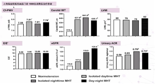上海瑞金醫院對高血壓門診1808名未接受降壓治療患者進行研究,對不同隱蔽性高血壓亞型進行探索,結果發現,無論是何種隱蔽性高血壓患者(白天血壓增高、夜間血壓增高、白天和夜間血壓均增高)都會出現不同程度的腎臟、血管等靶器官損傷(圖2)。